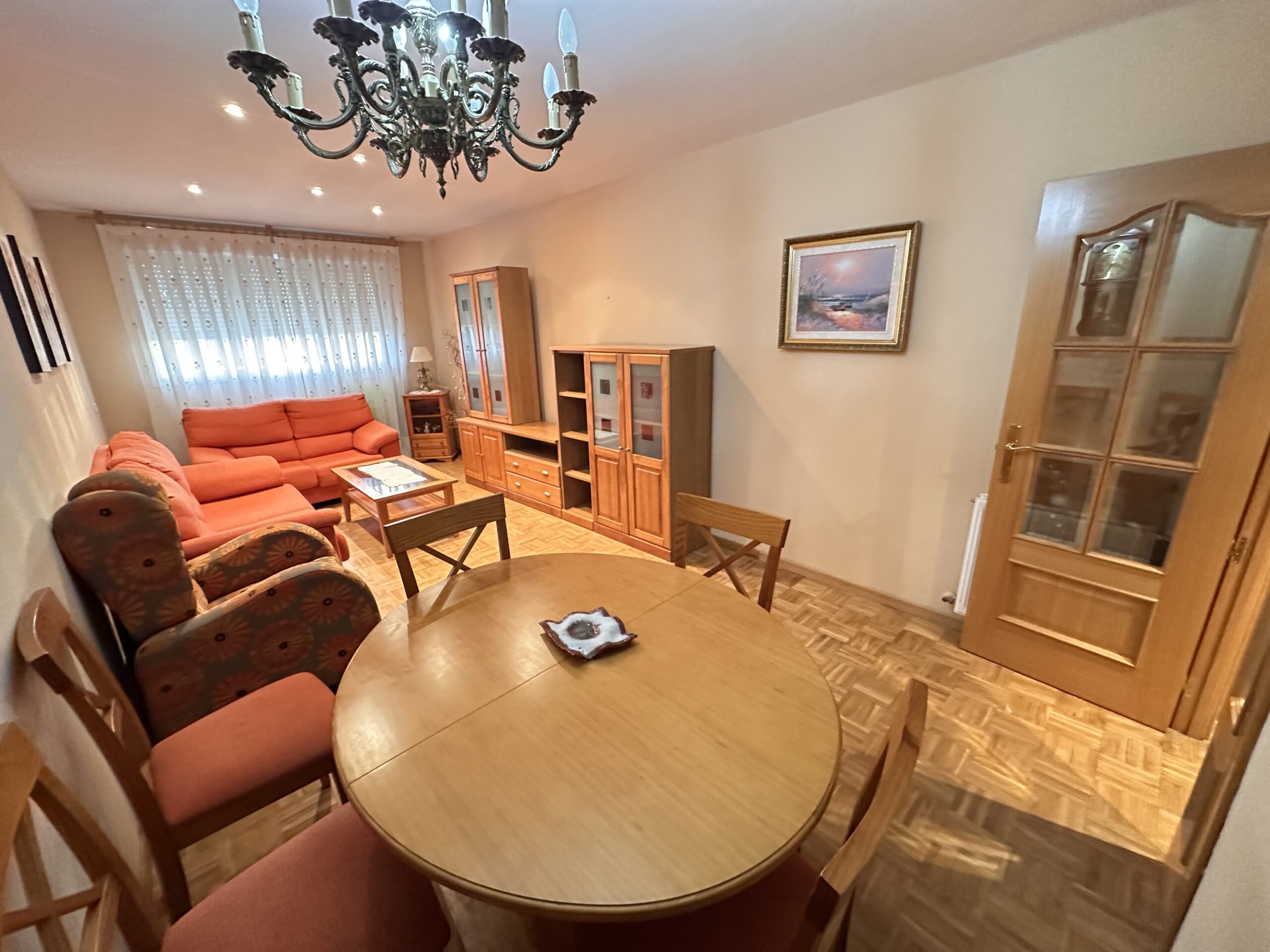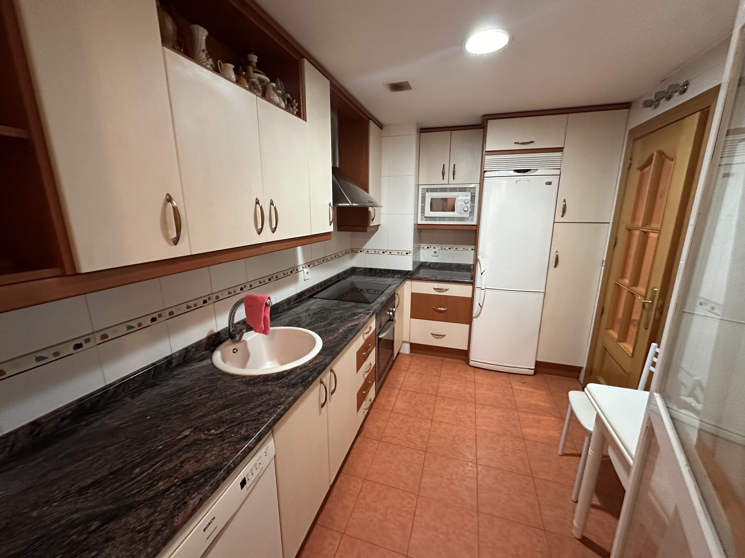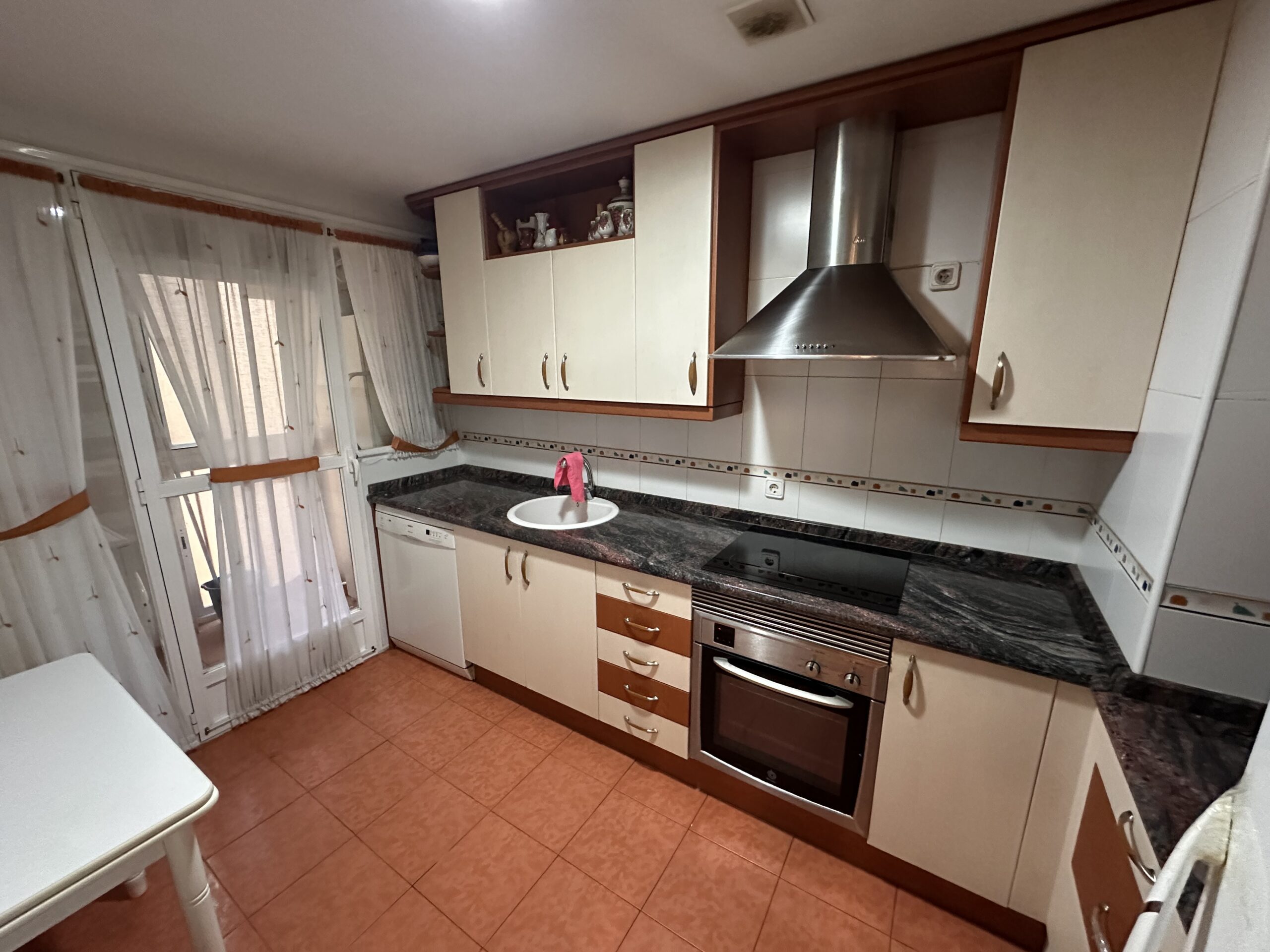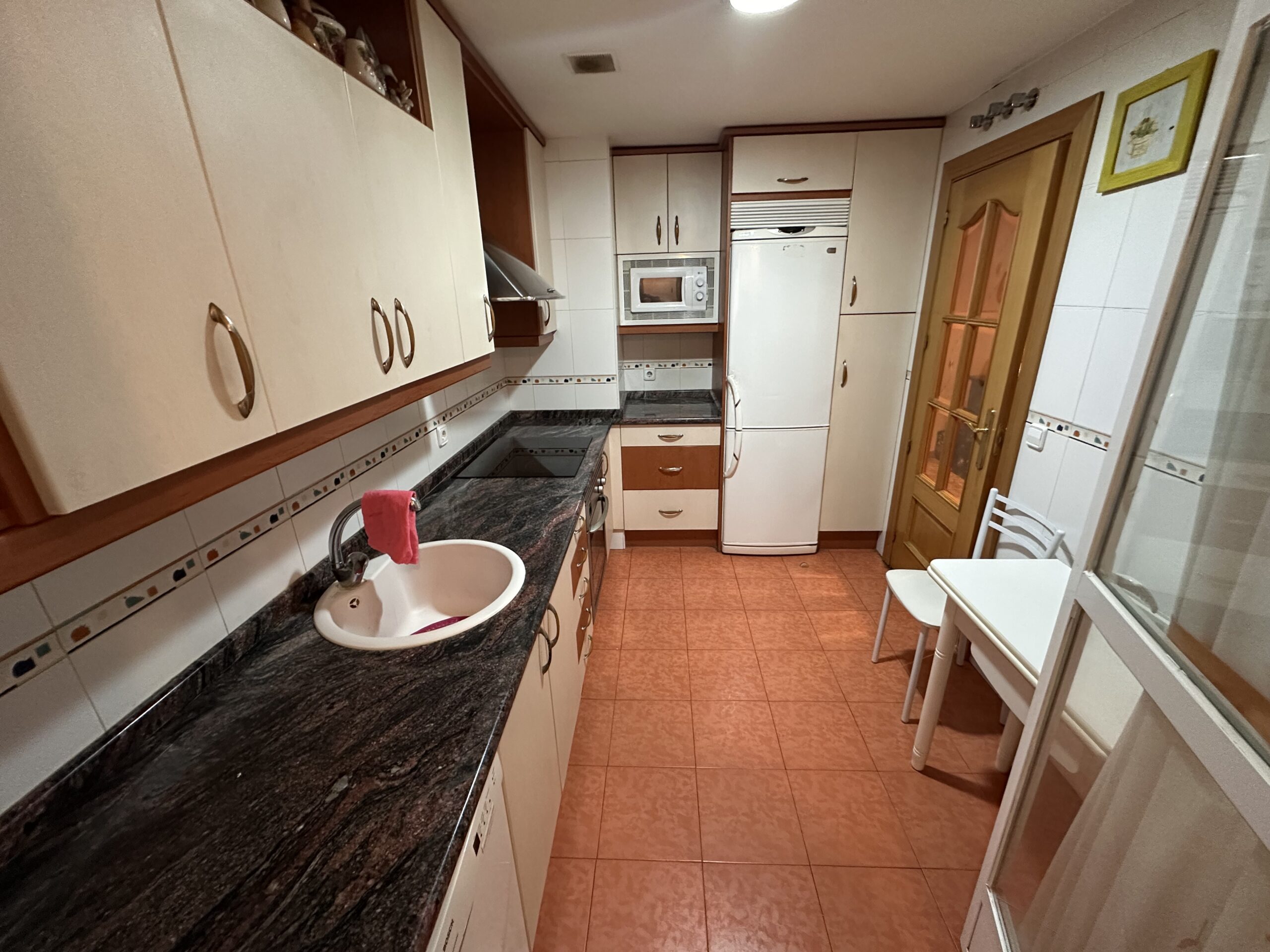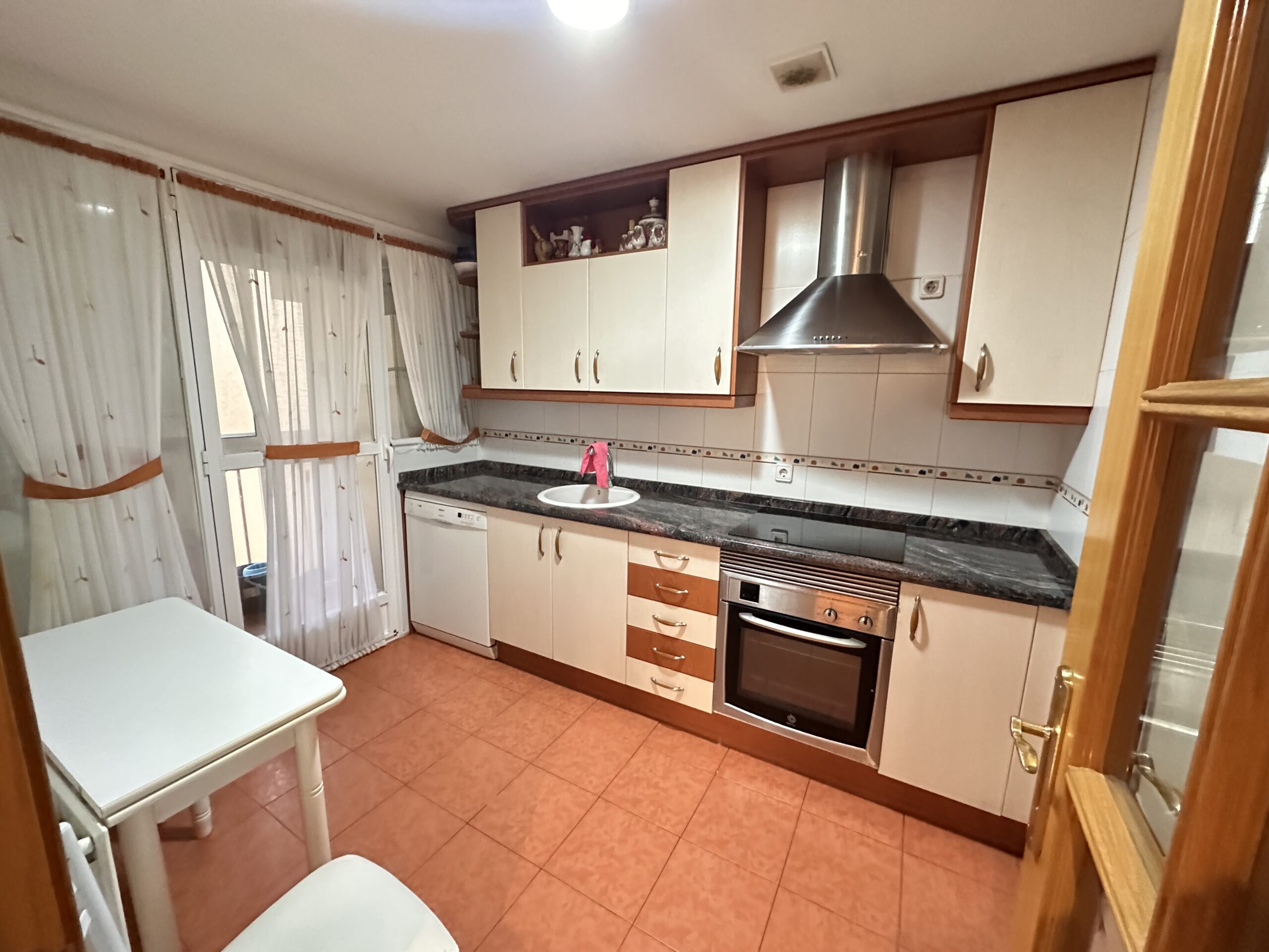 Piso de 90 metros útiles, amplio salón exterior, cocina amueblada con electrodomésticos, 3 dormitorios dos de ellos con armario empotrado, 2 baños uno completo con bañera y otro con ducha.